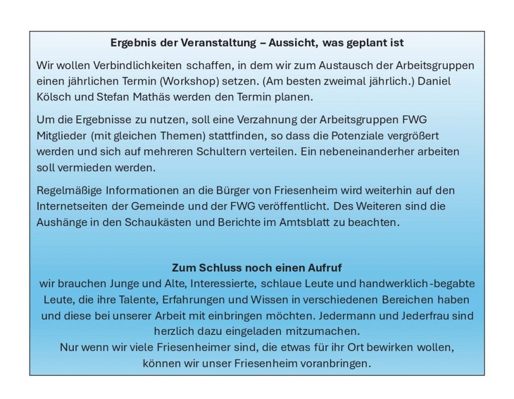 Wir freuen uns über jeden, der sich an den Projekten beteiligt oder neue Ideen für die Zukunft einbringt. Auch Friesenheimer, die keine FWG-Mitglieder sind, sind herzlich dazu eingeladen.