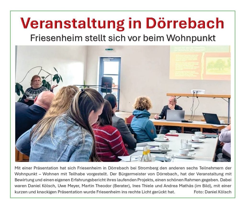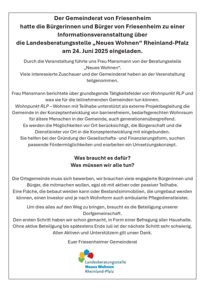 In der letzten Gemeinderatssitzung 2024 hat der Gemeiderat eine Teilnahme am Programm WohnpunktRLP beschlossen, Hier gab es einen Bewerbungsschluss für 2025 zu beachten. Da unsere Planung jedoch noch nicht ausreichend weit fortgeschritten ist, konnten wir in das Programm 2025 nicht aufgenommen werden. Für 2026 sollen wir mit konkreteren Plänen eine weitere Bewerbung starten. Hierfür werden wir die Ergebnisse aus dem Programm BedikK und aus der Unterstützung durch das Programm Neues Wohnen nutzen.
