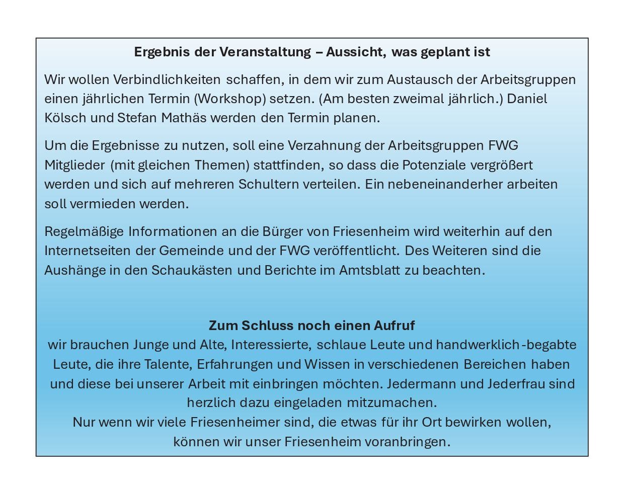 Es wurde bereits ein WhatsApp-Kanal „Events in Friesenheim“ eingerichtet in dem veranstalterunabhängig aktuelle Veranstaltungen gepostet werden. Bereits über 140 Bürger haben den Kanal aboniert.