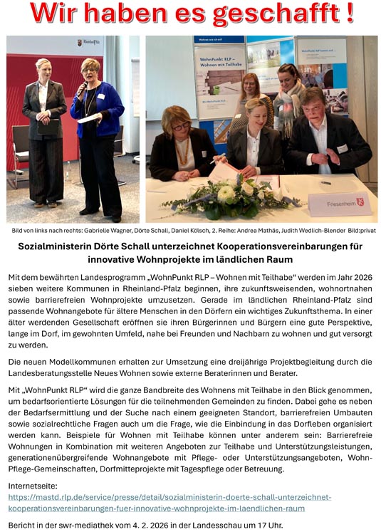 Unsere Bewerbung um das Förderprogramm WohnPunkt RLP war erfolgreich. Zusammen mit sechs weiteren Gemeinden in Rheinland-Pfalz wurden wir in das Förderprogramm 2026 aufgenommen. Am 4.2.2026 wurde im Beisein von Sozialministerin Dörte Schall in Mainz feierlich die Kooperationsvereinbarung unterzeichnet.